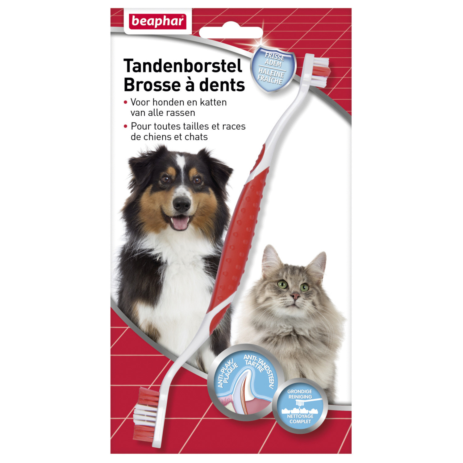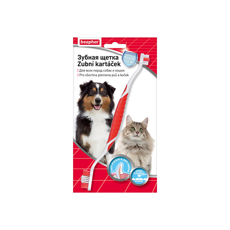 Зубная щетка Beaphar представляет собой двустороннюю щетку для очищения зубов собак и кошек всех размеров и пород. Мягкие и гибкие щетинки разной длины, разработанные по форме зубов животного, не травмируют десны и помогают очистить все зубы, даже в самых труднодоступных местах. Благодаря специальной прорезиненной ручке щетку удобно держать и она не выскальзывает во время использования. Подходит собакам и кошкам, особенно тем, которые питаются консервами, а не сухим кормом, для удаления остатков корма и налета на зубах и профилактики об разования зубного камня, неприятного запаха и порчи зубов.
