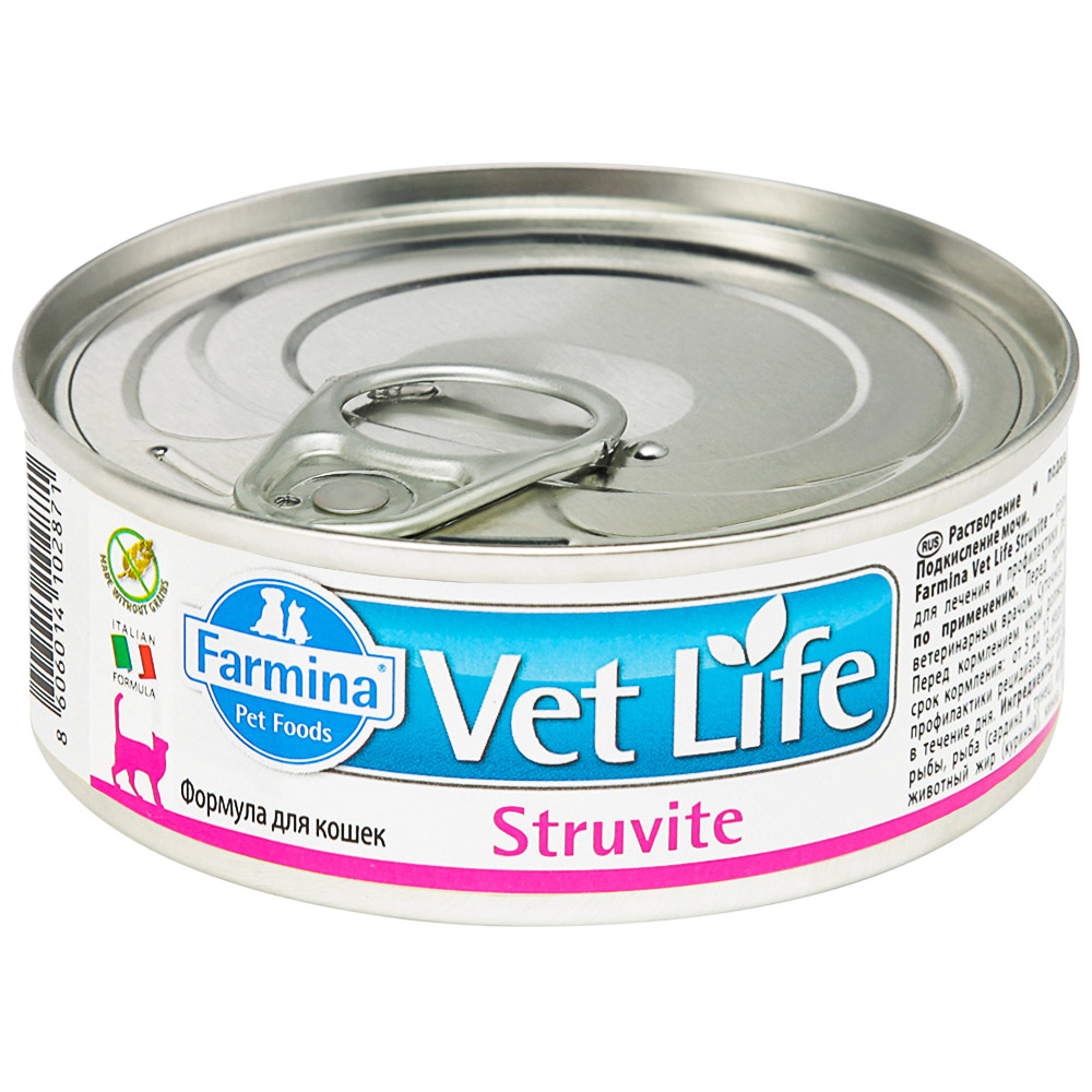 Farmina Vet Life Struvite – полнорационный диетический влажный корм для кошек для лечения и профилактики рецидивов струвитного уролитиаза. Растворение и подавление образования струвитных уролитов. Подкисление мочи. (Фармина)