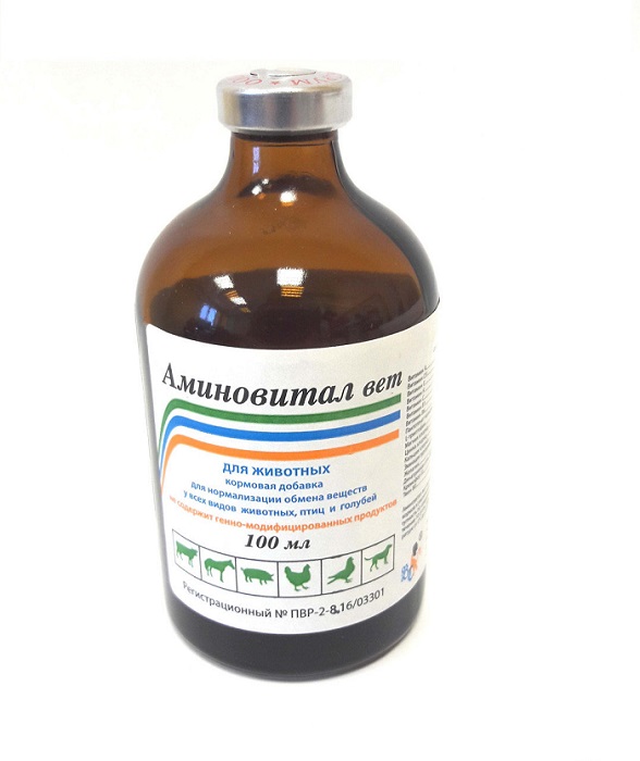 Аминовитал ВЕТ - кормовая добавка для нормализации обмена веществ у с/х животных, в том числе птиц и голубей, а также кошек и собак.
