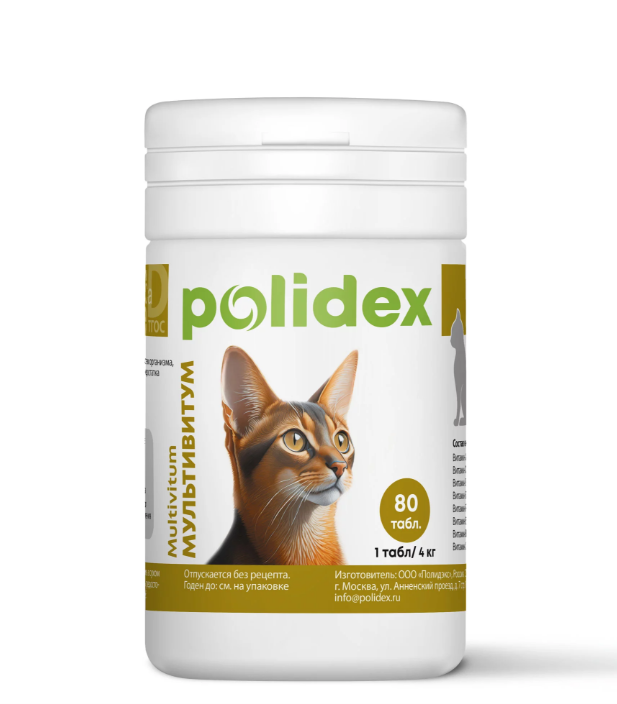 POLIDEX Multivitum (Полидекс Мультивитум) для взрослых кошек (комплекс, содержащий витамины, макро- и микроэлементы). При клинических испытаниях Multivitum (Полидекс Мультивитум) для взрослых кошек дополнительно отметили, что данный препарат также способствует нормализации обменных процессов в послеродовый период.