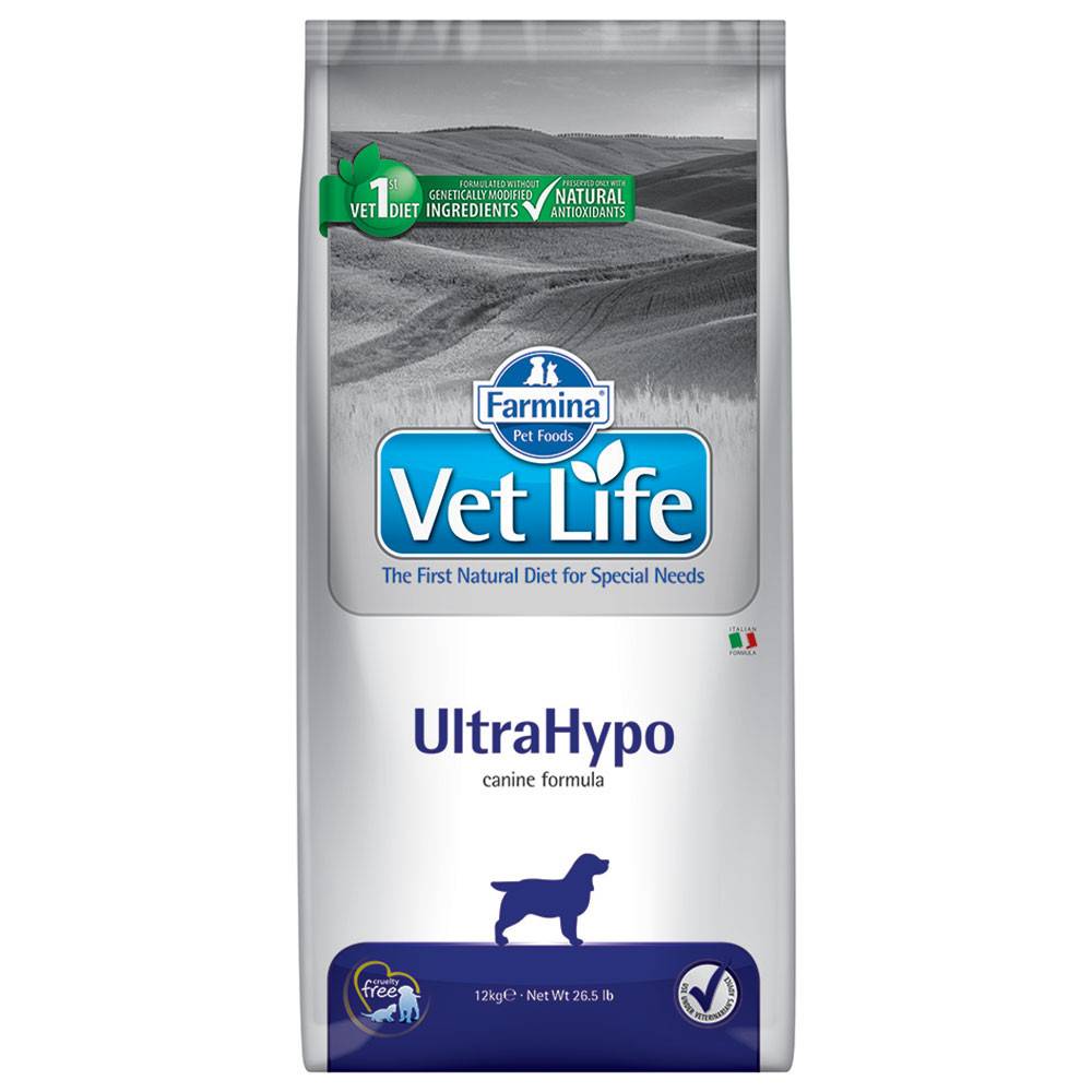 Farmina Vet Life UltraHypo - это полнорационный диетический корм для собак для снижения пищевой аллергии и/или непереносимости ингредиентов и питательных веществ. Исключающая диета. Поддержка функции кожи в случае дерматоза и чрезмерного выпадения шерсти. (Фармина)