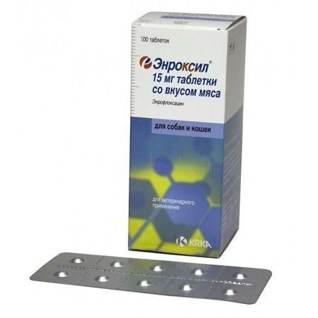 Энроксил таблетки со вкусом мяса для собак и кошек (международное непатентованное наименование: энрофлоксацин) в одной таблетке содержит 15 мг энрофлоксацина и вспомогательные компоненты: маннитол, кукурузный крахмал, крахмала гликолят натрия, сополимер метакриловой кислоты, лаурилсульфат натрия, дебутилсебацинат, кроскармеллозу натрия, коллоидный диоксид кремния, тальк, стеарат магния и ароматизатор запаха и вкуса мяса 10022.
