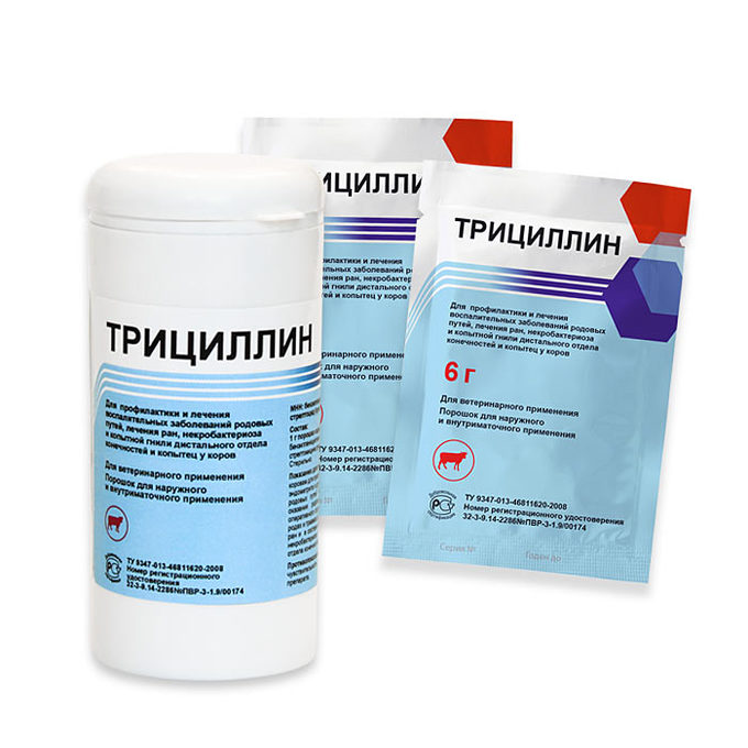 Комплексный антибактериальный препарат, действующими веществами которого являются антибиотики пенициллин, стрептомицин и сульфаниламид (белый растворимый стрептоцид). Препарат выпускают в форме мелкокристаллического порошка в герметично упакованных пакетах. Один пакет трициллина в порошке содержит 400000 ЕД пенициллина, 500000 ЕД стрептомицина и 5,0 г стрептоцида.
