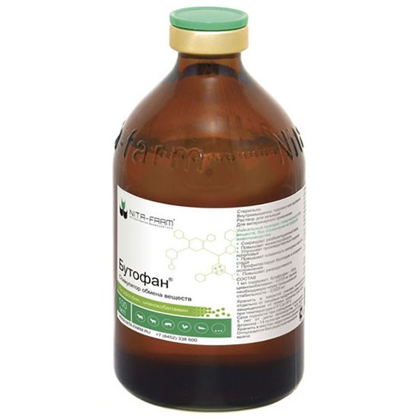 Бутофан (Butofan) - раствор для инъекций для стимуляции обмена веществ и неспецифической резистентности у животных. По внешнему виду препарат представляет собой прозрачную жидкость от розового до розово-красного цвета.