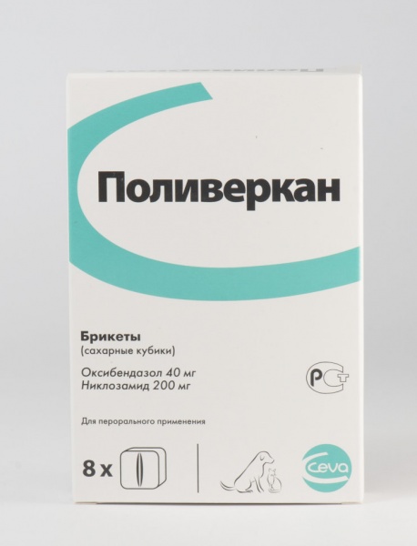Поливеркан – антигельминтный препарат, содержащий 40 мг оксибендазола, 200 мг никлозамида и наполнитель. Поливеркан представляет собой сахарный кубик массой 8 грамм, светло-желтого цвета, с разделяющей бороздкой посередине, растворимый в воде.