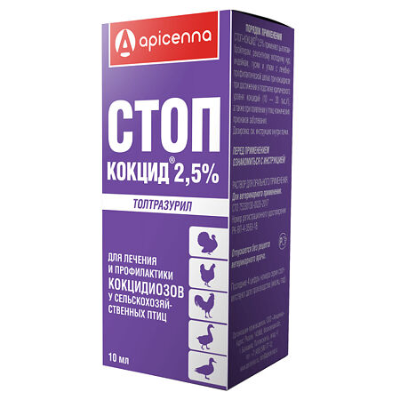 Стоп-кокцид 2,5% применяют цыплятам-бройлерам, ремонтному молодняку кур, индейкам, гусям и уткам с лечебно-профилактической целью при кокцидиозе при достижении в подстилке критического уровня кокцидий (10 — 20 тыс./г), а также при появлении у птиц клинических признаков заболевания.