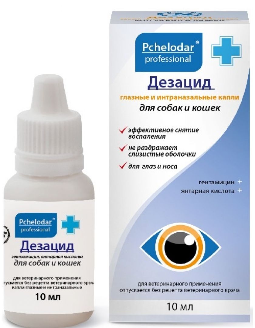 Глазные капли, предназначенные для лечения офтальмологических заболеваний и поверхностных дерматитов области вокруг глаз бактериальной этиологии у животных (собак, кошек и пушных зверей). Действующие вещества препарата оказывают выраженное противобактериальное, противовоспалительное, противовирусное и регенерирующее действие. Гентамицина сульфат является антибиотиком группы аминогликозидов, обладающий широким спектром действия в отношении разных видов грамположительных и грамотрицательных микроорганизмов. Янтарная кислота и пчелиное маточное молочко оказывают противовирусное, противовоспалительное действие, улучшают циркуляцию крови и трофику тканей, нормализуют внутриглазное давление, профилактируют развитие катаракты и глаукомы у животных. Дезацид при закапывании в конъюнктивальную полость не вызывает болевых ощущений у животного, хорошо проникает во все ткани глаза и быстро достигает в них устойчивого терапевтического уровня.